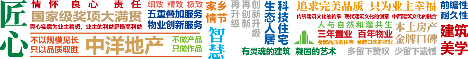 30載深耕江蘇,不以規模見長、只以品質取勝,一直用前瞻性和耐久性的戰略發展眼光,堅持走高品質樓盤路線,以業主居住的幸福指數衡量住宅的標準為追求,充分利用國內外先進的、成熟的綠色環保技術和材料,高度生態化、智能化,最大限度地提升居住的舒適度,建成國家標準的綠色節能、低碳生活示范住宅、生態之城、科技之城和3A級百年住宅,開發的地產項目有:以中洋水景園為代表的1.0版作品、中洋現代城為代表的2.0版作品、中洋·高爾夫公寓為代表的3.0版作品、中洋金磚公寓為代表的4.0版作品等,以及中洋金磚酒店為代表的商業地產項目,目前正在開發5.0版本作品——中洋金鑲玉公寓,以及海洋廣場商業綜合體。